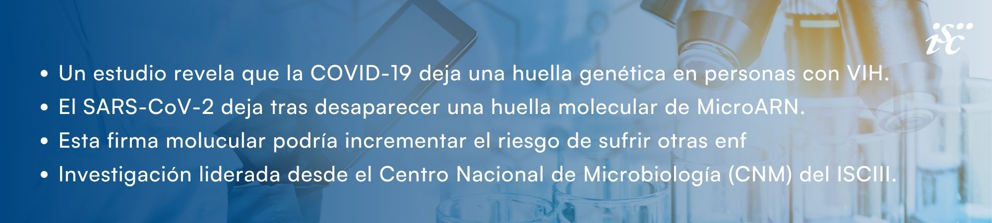 Un equipo de investigadoras del Centro Nacional de Microbiología (CNM) del Instituto de Salud Carlos III (ISCIII) ha llevado a cabo una investigación que analiza a medio plazo el impacto de la COVID-19 en personas con VIH. El estudio, que se ha publicado en la revista Journal of Infection and Public Health, revela la presencia de una ‘firma’ o ‘huella’ molecular específica de 35 microARNs (miRNAs) que persiste cuando el virus SARS-CoV-2 ya ha sido eliminado del organismo.