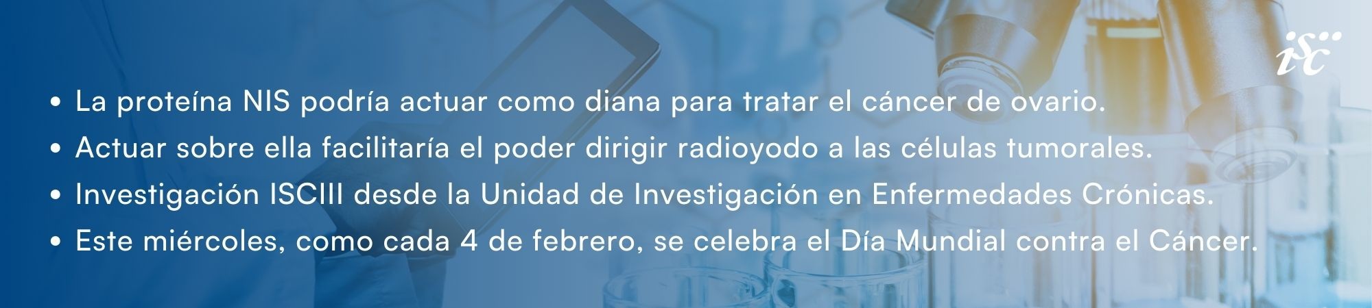 Una investigación liderada desde el Instituto de Salud Carlos III (ISCIII) aporta nuevas evidencias científicas de carácter preclínico de que la terapia con radioyodo (I-131), que se utiliza de forma habitual en algunos tumores de tiroides, podría ser una alternativa terapéutica prometedora en cáncer de ovario gracias al uso de una nueva diana, la proteína NIS.