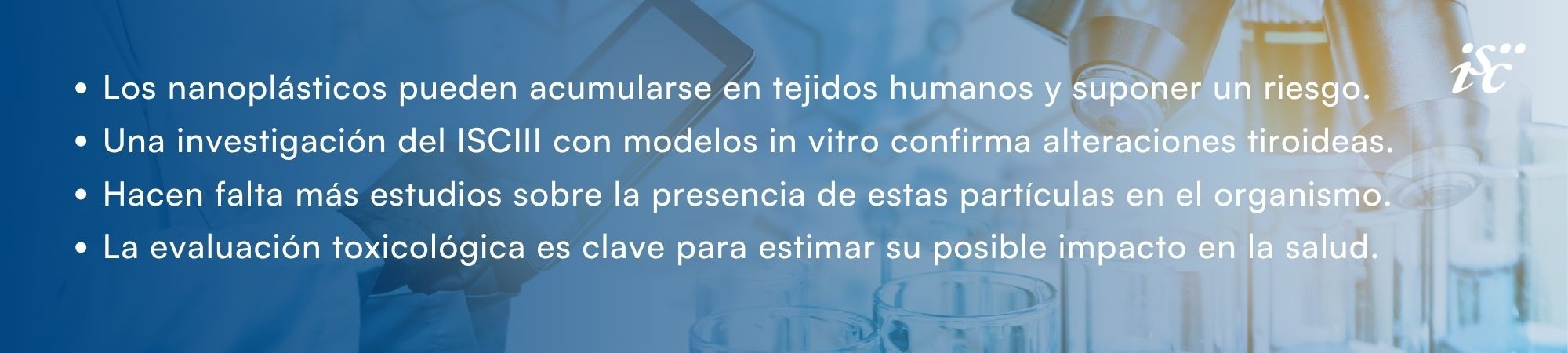 Un equipo multidisciplinar del Instituto de Salud Carlos III (ISCIII) ha identificado por primera vez, en estudios in vitro en modelos celulares y moleculares, los mecanismos mediante los cuales los nanoplásticos alteran la función tiroidea. Estas alteraciones, dependiendo del tiempo y de los niveles de exposición, podrían suponer riesgos para la salud. El estudio, publicado en la revista Journal of Hazardous Materials, está liderado desde el Centro Nacional de Sanidad Ambiental (CNSA) y la Unidad Funcional de Investigación en Enfermedades Crónicas (UFIEC) por los investigadores Mónica Torres Ruiz (CNSA) y Antonio De la Vieja (UFIEC).
