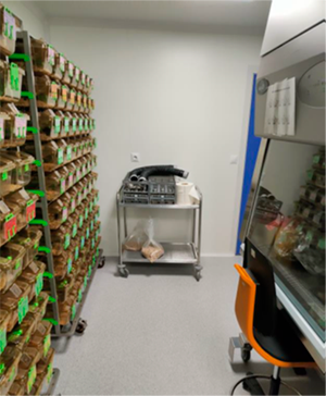 Donde se alojan conejos, pez cebra, hámster y cobayas. Aunque el acceso es restringido y la entrada se realiza con equipos de protección individual, no hay ducha de aire, y las medidas de contención son menores al tratarse de animales comerciales de estatus convencional de origen.