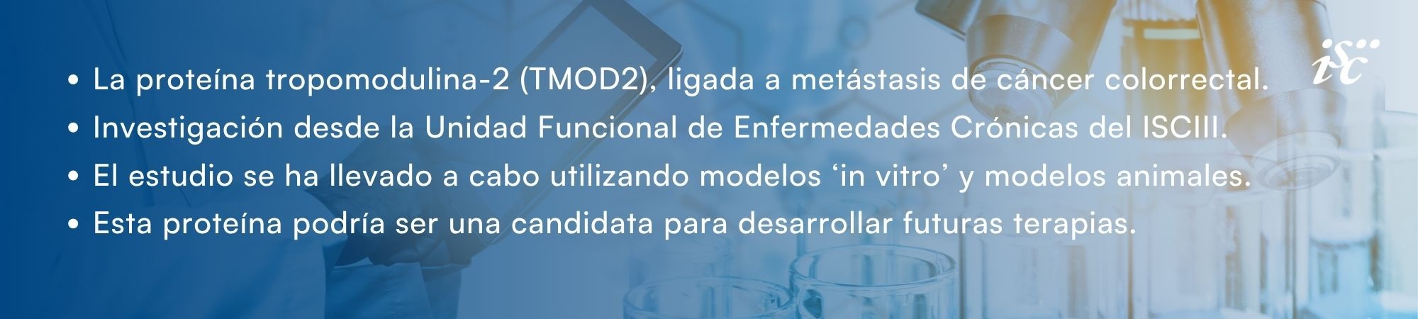 La tropomodulina-2 (TMOD2) es una proteína cuya expresión está alterada en células tumorales de cáncer colorrectal (CCR) con alta capacidad de metástasis hacia hígado, según ha confirmado el estudio coordinado por Rodrigo Barderas y Ana Montero, de la Unidad Funcional de Investigación en Enfermedades Crónicas (UFIEC) del ISCIII. Los resultados del estudio ahora publicado añaden nuevo conocimiento sobre su papel en la progresión del CCR al aportar datos que confirman la correlación entre la expresión aumentada de TMOD2, las etapas avanzadas de la enfermedad y una menor supervivencia de los pacientes.