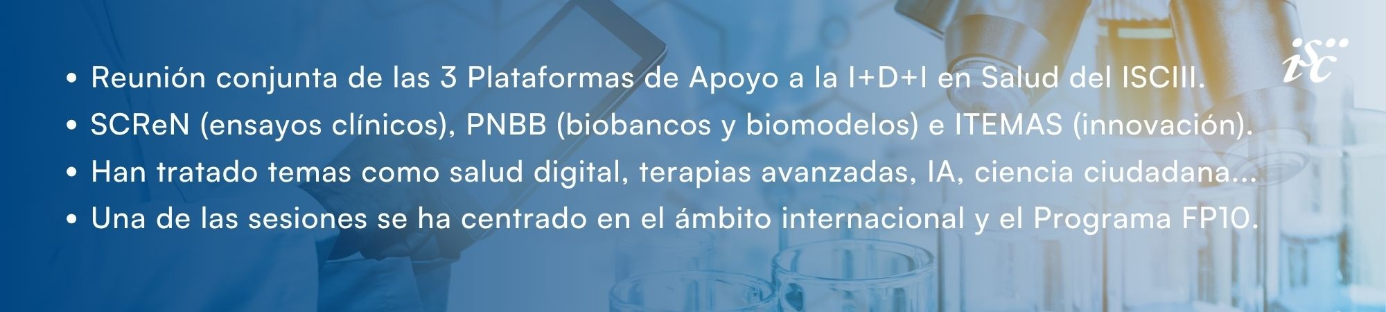 Las Plataformas ISCIII buscan fortalecer la capacidad científica y tecnológica del Sistema Nacional de Salud, impulsando la investigación biomédica de excelencia, la innovación y la colaboración entre instituciones. Las III Jornadas consolidan una visión conjunta, orientada a optimizar la coordinación entre las tres Plataformas, potenciar su internacionalización y fomentar proyectos de alto impacto en salud. Con ello, el ISCIII mantiene su compromiso con el desarrollo y financiación de infraestructuras de investigación sostenibles y abiertas a la comunidad científica, basadas en colaboración a nivel europeo e internacional, para mejorar la salud de la ciudadanía a través del conocimiento, la transferencia y la cooperación.