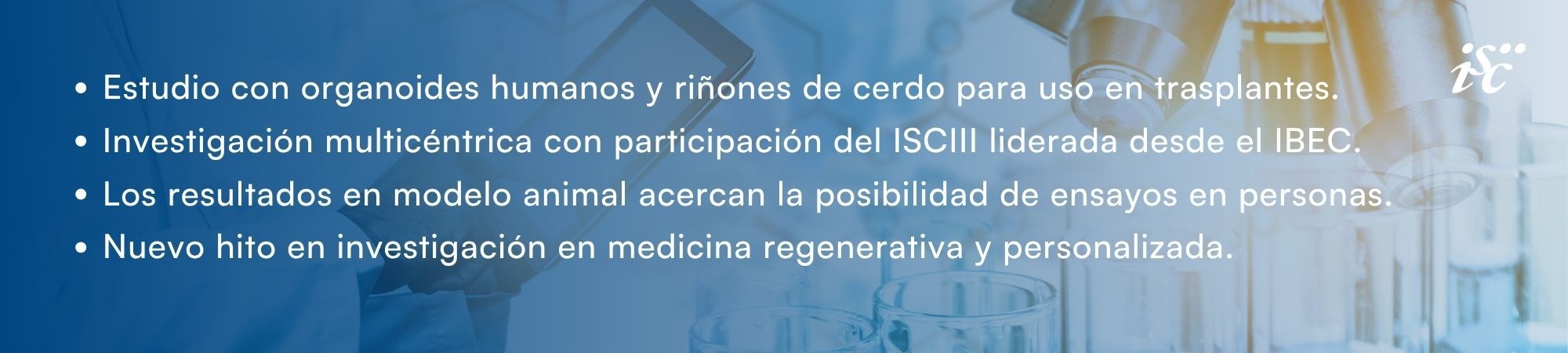 Un equipo español liderado por el Instituto de Bioingeniería de Cataluña (IBEC), con participación del Instituto de Salud Carlos III (ISCIII) y grupos de investigación internacionales, ha desarrollado una tecnología pionera que permite producir organoides renales humanos -mini riñones fabricados en laboratorio- de manera escalable, introducirlos en riñones de cerdo y trasplantar el riñón de manera autóloga en el mismo animal, evaluando su viabilidad y funcionabilidad después del trasplante.
